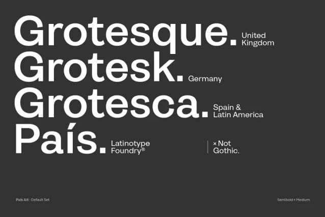 Pais Font Family is a contemporary and modern grotesque sans serif, inspired by the grotesques of the early 20th century, but more geometric and with a wider x-height than its referents; making it ideal for the current times.