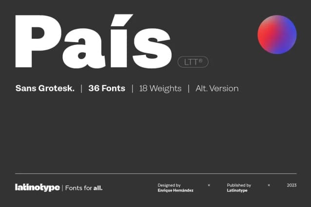 “País” comes in 2 versions, each with 9 weights, from thin to black, and matching italics, for a total of 36 fonts.