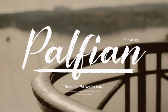Palfian Brush Font | Brush Solid Script, from Gracetypestudio, suitable for any projects such as: logos, branding projects, homeware designs, product packaging, mugs, quotes, posters, shopping bags, t-shirts, book covers, name card, invitation cards, greeting cards, label, photography, watermark, special events, and all your other lovely projects that need a Brush Solid Script taste.