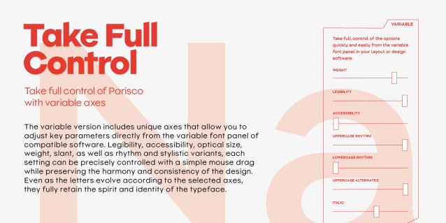 Parisco reveals a rare functional flexibility. Thanks to its variable features, everything from rhythm, optical size, and weight to italic angle and spacing can be adjusted instantly. All settings are visible at a glance through the variable font panel. Precision, speed, and intuitive control make every adjustment feel as smooth as a swipe.