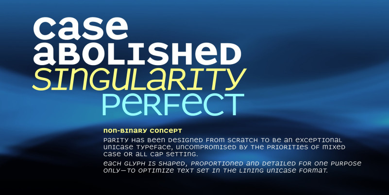 The Parity concept takes the minimalist unicase alphabet and expands it in another dimension, that of the megafamily encompassing a variety of weights, optical sizes and styles (roman/italic, serif/sans, proportional/monowidth)—of benefit whether fine tuning a single, quite specific font for the task at hand, or harmoniously combining several in the hierarchy of a multi-formatted page layout.