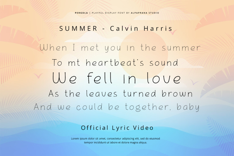 Pergola Display Font is a playful display font with authentic and playful feels. It will be perfectly used for Branding, Logo Design, Lettering, Logotype, Clothing, Poster, magazine, packaging, posters, shopping bags, t-shirts, book covers, photography, special events and other design project.