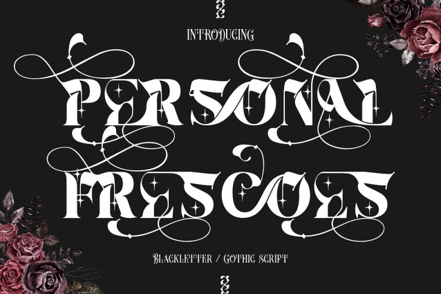 Personal Frescoes Font – A Luxurious Baroque Blackletter Font, a decorative blackletter display font infused with baroque opulence and modern gothic energy. Each letter is boldly structured with sharp blackletter forms, while elegant flourishes, swashes, and sparkling star-like details add a touch of drama and refinement. This font exudes power and artistry, making it perfect for luxury branding, gothic-inspired posters, music covers, tattoo designs, editorial layouts, and any project that demands a sense of grandeur and mystique.