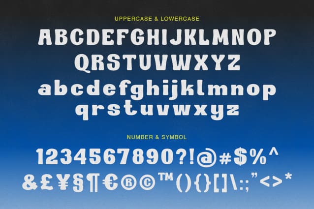 A retro-inspired display font with a fun and nostalgic touch! With its bold, slightly rounded letterforms, Pillbery brings a vintage yet modern feel to your designs.