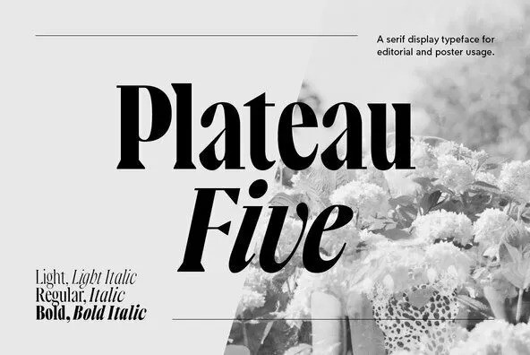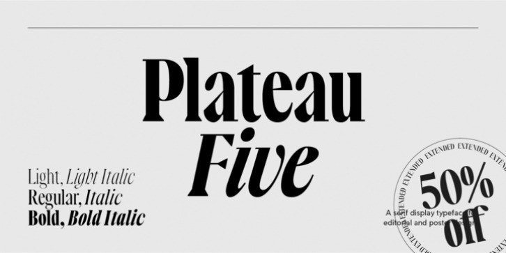 Plateau Five is a display typeface with an appearance mostly based on forms of the Âtransitional period between Baroque and Neo-Classicism and has an underlying rigid structure. Its capital letters are heavy, the serifs Âprominent and the generally expressive tone that comes with italics is muted.