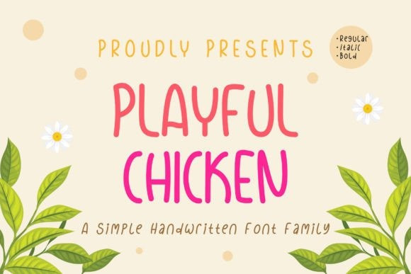 Playful Chicken Font is a simple and fun handwritten font family that will make your design project more lively and cheerful. This font family features three styles, regular, italic and bold, that will give you more options and versatility. Whether you need to create logos, posters, flyers, banners, or social media graphics, Playful Chicken will add a touch of whimsy and creativity to your designs. Download Playful Chicken today and enjoy this simple handwritten font family.