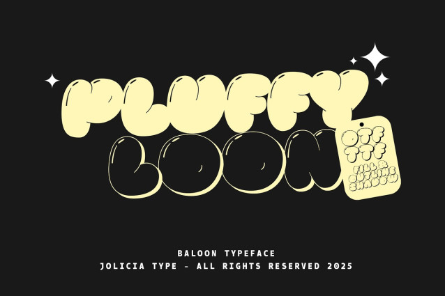 Pluffy Loon is a bold, playful balloon-style font that’s full of life and imagination. Each letter is crafted to look like an inflated balloon, complete with shiny highlights that create a fun, three-dimensional effect — just like a real helium balloon ready to float!