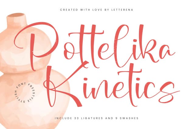 Pottelika Kinetics Font – Freestyle Stylish Font , from Letterena, is a Luxury Script font, suitable for any projects such as: logos, branding projects, homeware designs, product packaging, mugs, quotes, posters, shopping bags, t-shirts, book covers, name card, invitation cards, greeting cards, label, photography, watermark, special events, and all your other luxury and beautiful projects that need a Luxury Script taste.