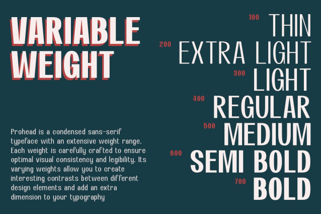 Prohead Font modern sans-serif condensed font with 7 versatile weights that blend the elegance of classic design with contemporary trends. Its clean and professional look makes it the perfect choice for logos, branding, web design, packaging, and more. With 7 distinct weights, you have the flexibility to create bold headlines, refined body text, and everything in between. Designed with legibility and style in mind, Prohead adapts seamlessly to any design style, whether you’re aiming for a minimalistic aesthetic or a modern classic approach.