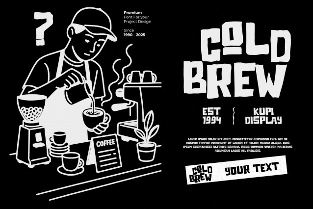 PTG Brewla Font is a bold and expressive display font inspired by the warmth of a coffee shop. With bold, organic, and characterful letterforms, this font evokes a warm, freshly brewed cup of coffee.