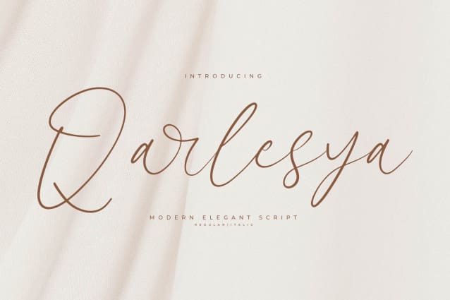 Qarlesya Script Font – Modern Elegant Script, from Letterena, is a Luxury Script font, suitable for any projects such as: logos, branding projects, homeware designs, product packaging, mugs, quotes, posters, shopping bags, t-shirts, book covers, name card, invitation cards, greeting cards, label, photography, watermark, special events, and all your other luxury and beautiful projects that need a Luxury serif taste.