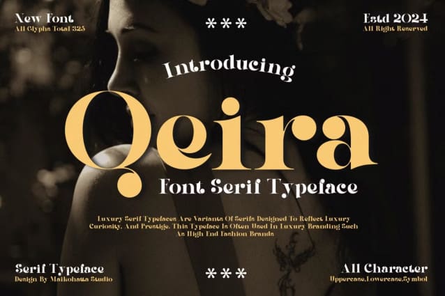 Qeira Font – Elegant Serif Typeface. This font is a type of letter that has special characteristics that create the impression of luxury, elegance and firmness. This font involves a series of design elements such as balanced thin and thick lines, gentle curves, and elegant and clean serifs. The sharp corners and fine details of each character create a highly aesthetic impression and exude an air of elegance.