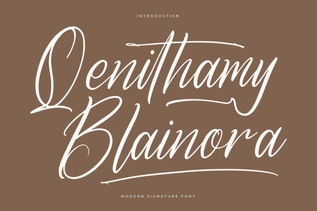 Qenithamy Blainora Font – Modern Signature Font , from Letterena, is a Luxury Script font, suitable for any projects such as: logos, branding projects, homeware designs, product packaging, mugs, quotes, posters, shopping bags, t-shirts, book covers, name card, invitation cards, greeting cards, label, photography, watermark, special events, and all your other luxury and beautiful projects that need a Luxury Script taste.