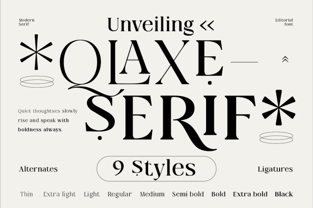 Qlaxe Serif Font is a classic modern serif font that combines timeless charm with refined contemporary style. With 9 elegant styles and unique ligatures, Qlaxe is perfect for sophisticated branding, editorial design, and premium packaging.