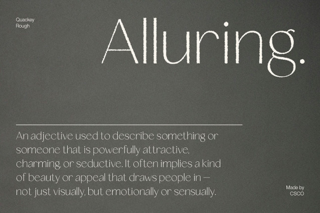 Combining Professionalism with Expressive Flair Quackey Rough bridges the gap between minimalism and artistry, making it perfect for designers seeking a font that balances sleek professionalism with a subtle artistic edge. Whether used in luxury branding or contemporary creative projects, it delivers a memorable and refined impression.