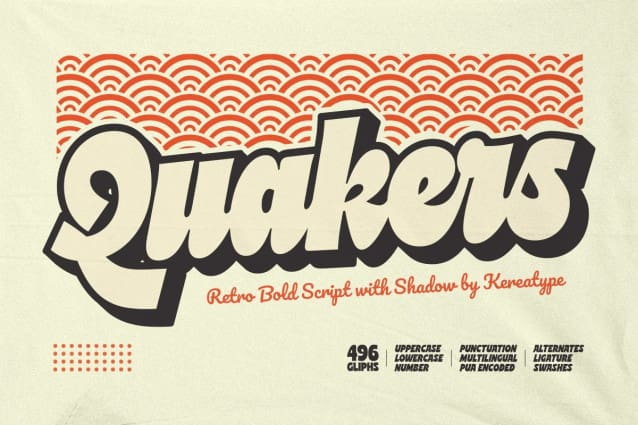 Quakers Font is equipped with a font shadow that will make it easier and save you time in creating typography works like: Vintage branding craft logos, Brand identities with nostalgic charm, retro themed businesses, invitations for weddings, parties, or events, eye-catching design posters, banners, and signage that stand out, Product packaging into retro masterpieces to your labels and boxes