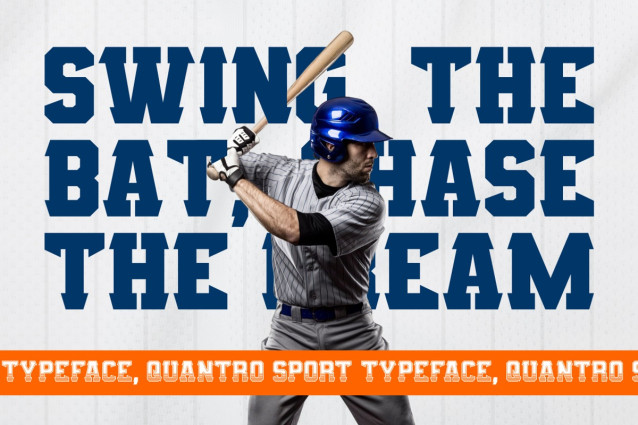 Designed with athletic identity in mind, Quantro Sport is ideal for branding, posters, packaging, and editorial headlines in the sports, fitness, or varsity merchandise sector. Its geometric precision and assertive tone make it especially suited for baseball-themed graphics, gym signage, and youth sports clubs. Use it to craft motivational slogans, bold cover designs, or merchandise that needs to embody strength, teamwork, and tradition. The typeface includes numerals, punctuation, and multilingual support for wide usage scenarios.