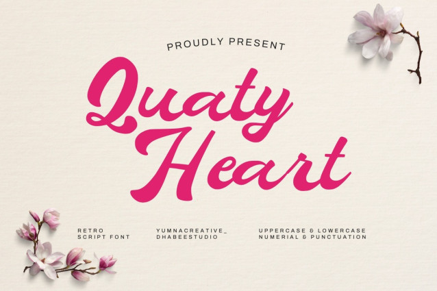 Quaty Heart Font – Retro Script Font. This Font is a delicate, elegant and flowing handwritten font. It has beautiful and well as a unique blend of ligatures a letter, so that the authors compose it with a and little swirly embedding, so that a modern font is formed and ready to make a statement by adding elegant and unique flair to your next design project. Add it to your most creative ideas and notice how it makes them come alive!