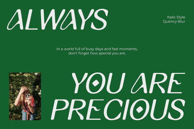 Refined, Feminine, and Distinctly Unique Quency Blur’s gentle flow and ethereal blur make it a standout choice for those seeking to communicate elegance, creativity, and uniqueness. It adds a luxurious softness to your typography while maintaining legibility and versatility across print and digital media.