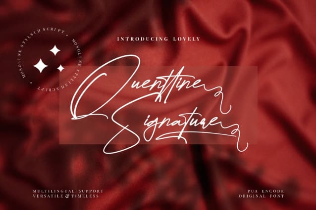 Quenttine Signature Font – Monoline Signature Font , from FinTypeStudio, suitable for any projects such as: logos, branding projects, homeware designs, product packaging, mugs, quotes, posters, shopping bags, t-shirts, book covers, name card, invitation cards, greeting cards, label, photography, watermark, special events, and all your other lovely projects that need a beautiful script taste.