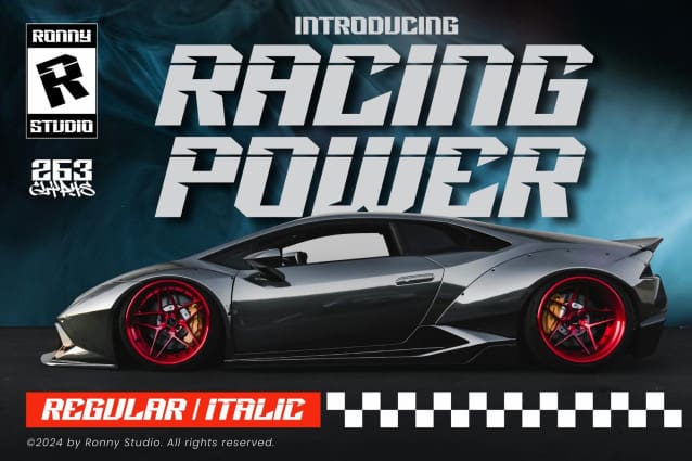 Racing Power font is used only for demos (Demo license). If you want to use this font for commercial use please contact: https://ronny-studio.com/b/racing-power-racing-font