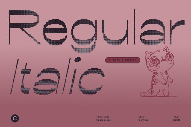 Raely Disco Font This is a sans serif font that fuses retro inspiration, funky reverse contrast, and disco-era excitement into one striking typeface. Its unconventional structure and playful proportions create a visually dynamic rhythm, delivering a look that feels nostalgic, expressive, and full of movement like typography dancing under flashing lights.
