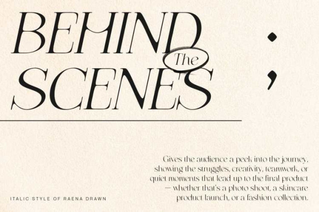 Raena Drawn Font is a modern serif font that embraces a slim, clean, and elegantly refined structure, drawing inspiration from contemporary editorial aesthetics while incorporating the gentle irregularities of hand-drawn detail. Its slim letterforms and sharp serifs create a sense of precision and sophistication, perfectly suited for designs that prioritize clarity and elegance.