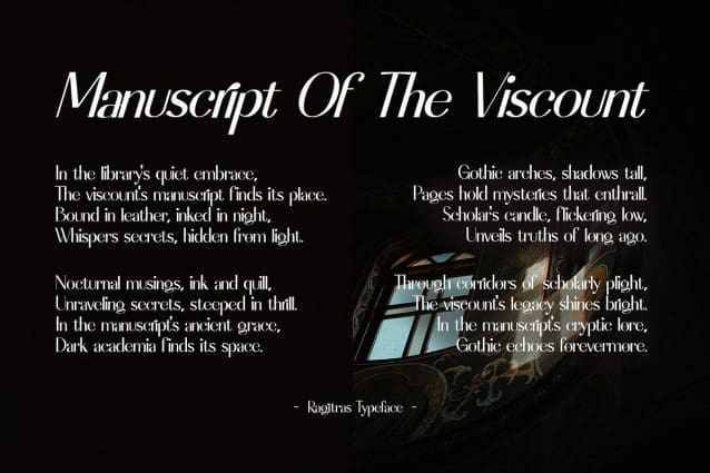 Ragitras Font is Ideal for: Logos and branding that demand attention and convey a sense of luxury, Elegant wedding invitations and stationery that leave a lasting impression, High-end packaging designs that elevate your product’s perceived value, Magazine layouts and marketing materials that crave a touch of timeless sophistication, Any design project where a unique and beautiful serif font is desired.