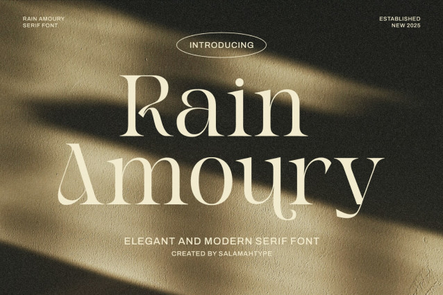 Rain Amoury is a sleek, stylish serif font that’s perfect for logos, weddings, beauty brands, fashion, and more. With smooth curves, fancy details, and an oblique version, it makes any project look polished and high-end.