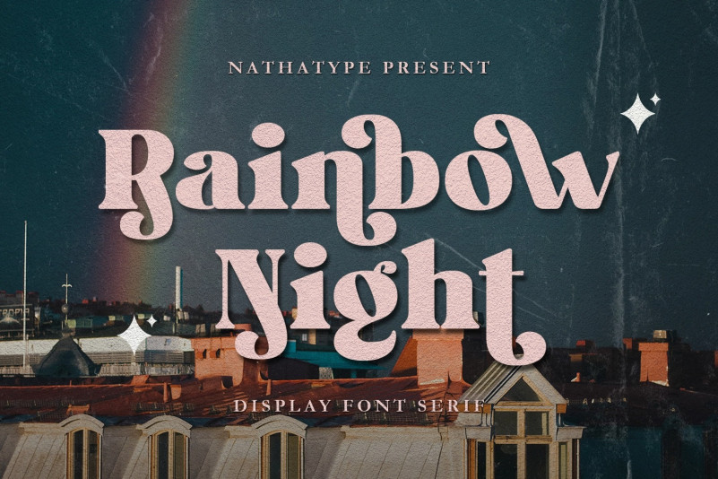 Rainbow Night Serif Font is an elegant, prominent display serif font to attract everyone who sees it. A serif font is a font with hooks and tiny scratches attached to the letters’ edges. The huge serif size adjacent to each other in such a font makes the letters look heavier. Moreover, this font is deliberately created in thick lines and strong contrasts as the characters of a display font to produce strong visual displays. Generally, such a display serif font can show elegant, classy nuances to assign a strong identity to the brand, to stand the desired messages out, and to get the messages easily recognized by readers. You can apply this font for various text sizes due to its great legibility. In addition, you can make use of the available features here as well.