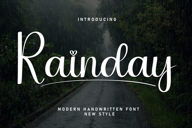 Rainday Font A popular and professional script font. Modern and elegant, this typeface is made of beautiful creative strokes.This font is perfect for your creative ideas, both formal and informal. It has a modern style with a touch of creative ideas that is very suitable to be applied anywhere that requires creative ideas such as invitation cards,letterheads, website logos, social media, banners, advertisements, brochures, packaging products, leather products, and any product that requires writing.