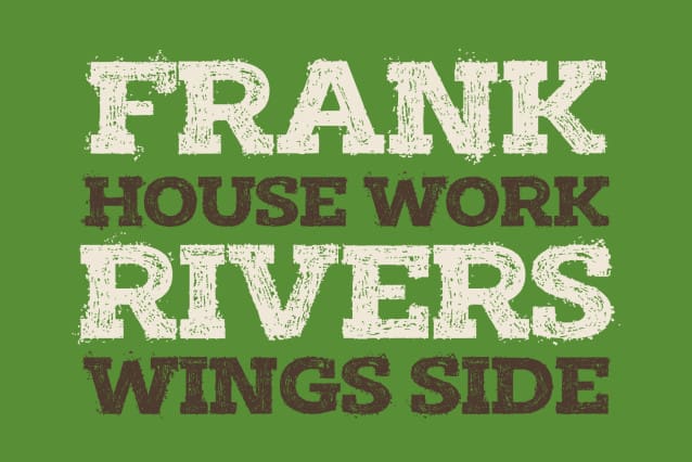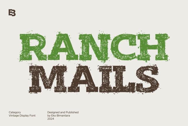 Ranch Mails Font is a bold, all-caps vintage display font characterized by its rough and raw aesthetic. Perfect for evoking a rustic, old-style charm, it fits themes related to food, product branding, and vintage design. Its rugged personality is ideal for large-size displays, titles, and headers, making it a great choice for brand identities, product packaging, and broad graphic design projects with a rustic or raw edge. Ranch Mails brings a timeless, rugged look to any creative layout or design.