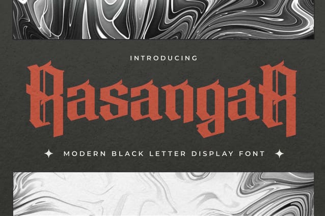 Rasangar Blackletter Font – This Is Blackletter Display Font.This is a Textured Natural Style and classy style with a clear style and dramatic movement. This font Rasangar is great for your next creative project such as logos, printed quotes, invitations, cards, product packaging, headers, Logotype, Letterhead, Poster, Design this font is great for your creative projects such as watermark on photography, and perfect for logos & branding, invitation,advertisements,product designs, stationery, wedding designs,label ,product packaging, special events or anything that need handwritting taste. That is has charming, authentic and relaxed characteristic more natural look to your text.