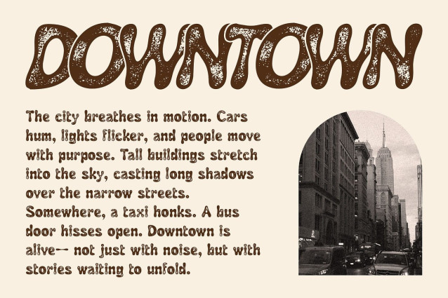Funky Feel with Vintage Flair The font’s groovy form is enhanced by a stamp effect, introducing a textured, raw, and handmade look. This gives it a tactile, nostalgic quality—as if each letter was printed by hand—adding depth and authenticity to any design.