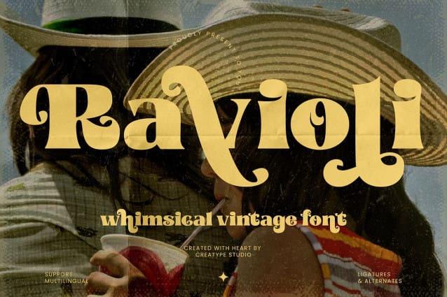 Ravioli Font – Whimsical Vintage is a bold, nostalgic typeface that captures the groovy charm of retro design. Its playful curves and intricate details create a unique personality, perfect for projects that demand a vibrant and lively touch. From quirky branding to retro-inspired posters, Ravioli Font brings an electrifying energy to every design.