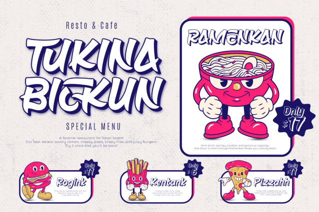 Whether you’re designing restaurant menus, storefront signs, beverage packaging, or nostalgic branding, Reasin Brukut brings personality and visual impact that stands out in both print and digital formats.