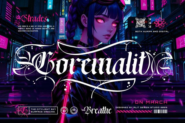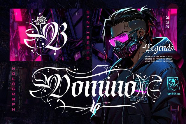 Rebella Blackletter Font, a stunning blackletter script designed by Alit Design Studio. Rebella captures the soul of the streets, blending the timeless elegance of calligraphy with an edgy, cyberpunk aesthetic.