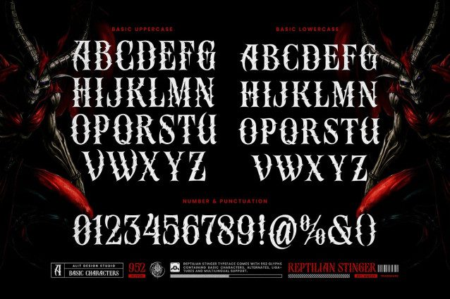 Reftilian Stinger Font an aggressive and menacing dark gothic typeface. This is not just a font; it’s an arsenal of predatory style, meticulously designed for projects that demand a sharp, powerful, and venomous aesthetic.