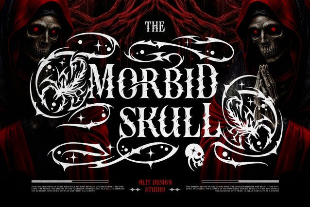Reptilian Stinger is forged from the very essence of fear and shadow. The base letterforms are a “fierce serif” (blackletter) style, where each character is armed with dangerously sharp thorns and barbed edges. The flared, high-contrast strokes give it a dominant and brutal presence, perfect for making an unforgettable statement.