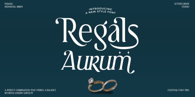 It contains uppercase, number, punctuation, symbols and support multilingual. Regals Aurum font is great for branding, business cards, logo, poster, t-shirt, photography, invitations, and more.