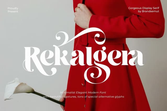 Rekalgera Font is a unique, elegant and classy display serif, best used as a display for headings, logos, branding, magazines, product packaging and invitations. Rekalgera equipped with Ligature and many Alternates and come with clean lines and smooth curves give any project an extra touch of class.
