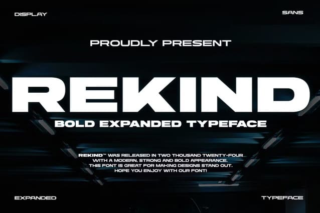 Rekind Expanded Font is a great looking bold sans serif font with a modern look and is strong and bold. Designed to make a strong impression and stand out in a variety of design contexts. This font is also suitable to be applied especially in logo, branding, promotions, posters, book covers, magazine layouts, social media, headlines, titling, movie title, logo brand, logo company, layout website and other design.