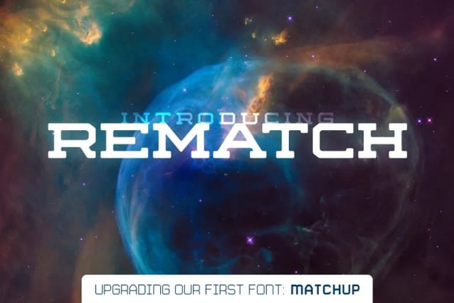 It was time for an update. Rematch Font is a more polished and clean typeface. It remains an extended font with slab serifs and a bold weight. This family has two versions, regular and rounded. Rematch will work great as a bold display font that packs a punch. It has some extra flair to go along with the traditional letterforms of a wide slab serif.