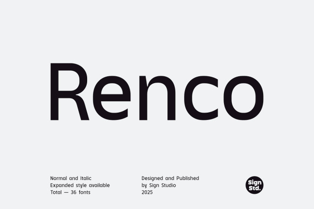 Renco features vertically cut terminals, low contrast ascenders, and low contrast inktraps, giving it a distinctive yet highly readable appearance. Equipped with Cyrillic characters, it supports multiple languages, making it a practical choice for international typography.