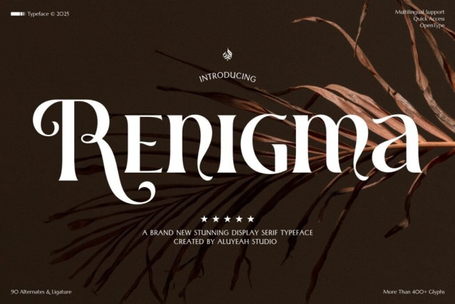 Renigma Font, a stylish and versatile font that offers more than 400 glyphs, over 90 alternates and ligatures, Quick Access, OpenType and Multilingual support for 67 languages. Its quick access feature makes it easy to use all of its stunning alternates and ligatures, allowing you to create beautiful designs with ease. Creating beautiful designs has never been easier.
