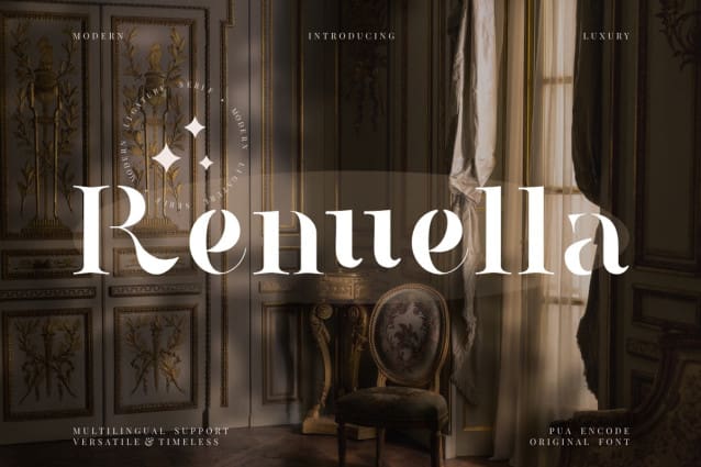 Renuella Serif Font – Luxury Serif Font , from FinTypeStudio, suitable for any projects such as: logos, branding projects, homeware designs, product packaging, mugs, quotes, posters, shopping bags, t-shirts, book covers, name card, invitation cards, greeting cards, label, photography, watermark, special events, and all your other lovely projects that need a beautiful serif taste.