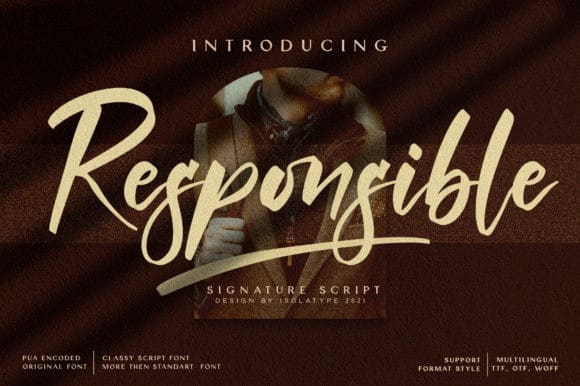 This font is made for personal use. Get the full version of the fonts if you want to use it for commercial purposes by purchasing the licenses here: https://www.creativefabrica.com/product/responsible/