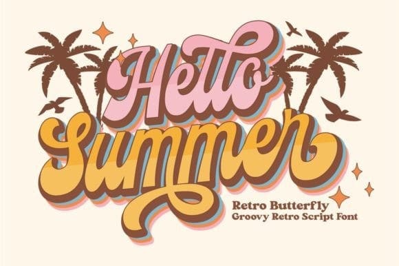 Retro Butterfly Font, is a groovy retro script font with a sense of funk, fun, and free-spiritedness. This font is characterized by its bold, flowing strokes and exaggerated curves, reminiscent of the hand-drawn lettering seen in vintage psychedelic posters and album covers.