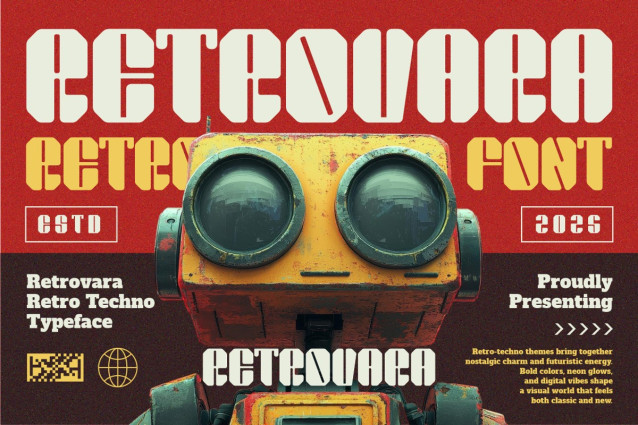 Retrovara Retro Techno Display Font works especially well for logo design, branding systems, advertising visuals, and bold headlines. The font brings a strong identity to posters, packaging, magazine covers, and book covers that require a memorable look. It also suits film titles, stickers, business materials, and creative merchandise that aim for a retro or classic atmosphere. The bold construction helps messages feel confident, powerful, and reliable. Designers can use this font to create nostalgic themes with a modern twist. The typeface supports clear communication while adding personality and character. Retrovara Retro Techno Display Font fits creative projects that want to stand out without feeling playful or casual. It delivers a serious retro presence that feels strong, iconic, and visually striking across many design applications.