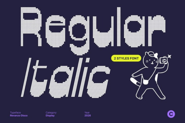 Revanzo Disco Font This brings retro funkiness to life through a striking reverse-contrast design. Thick vertical strokes paired with thinner horizontals flip traditional typography on its head, creating a bold, eye-catching rhythm that instantly commands attention.